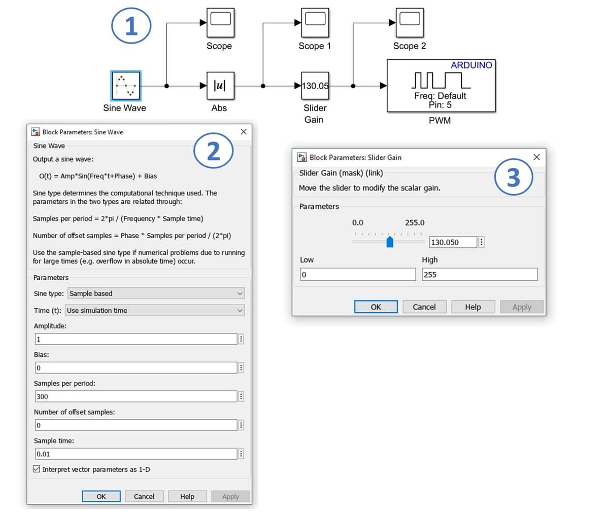 - Connect a Slider Gain block (from Math Operations). You can specify the lower (Low) and upper (High) limits of the gain to constrain the output voltage. For example, to limit the voltage to 2.3 V: 256 × 2.3 = 117.76 ≈ 117. In this case, the upper limit (High) for the saturation block would be set to 117. However, for this exercise, set the upper limit to 255 (equivalent to 5 V on the Arduino Uno) (3).