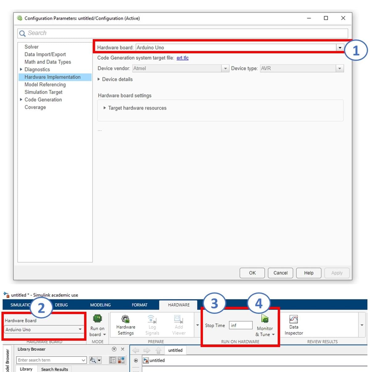 - From the left-hand menu, select Hardware Implementation. Under Hardware board, choose Arduino Uno from the list, then click Apply and OK (1). Note that other boards can be used beyond that of the Ardruino Uno.